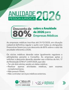As empresas médicas inscritas até 31/12/2025, em situação cadastral definitiva regular e quite com todas as obrigações financeiras fazem jus a um desconto de 80% sobre o valor da anuidade referente a 2026.