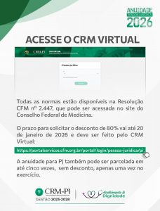 O prazo para solicitar o desconto de 80% vai até 20 de janeiro de 2026 e deve ser feito pelo CRM Virtual: https://portalservicos.cfm.org.br/portal/login/pessoa-juridica/pi