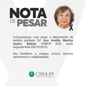 Comunicamos com pesar o falecimento da médica pediatra Drª Ana Amélia Martins Soares Batista (CRM-PI 1212), nesta segunda-feira (09/10/2023).