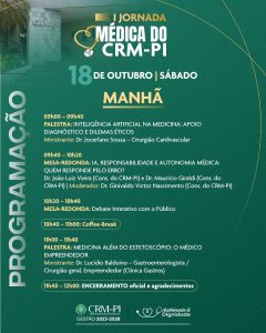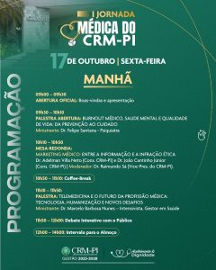 A I Jornada Médica do CRM-PI reunirá especialistas para debater temas atuais e relevantes sobre a prática médica, saúde mental, ética profissional, os desafios do futuro da profissão. empreendedorismo na medicina, ato médico, entre outros.