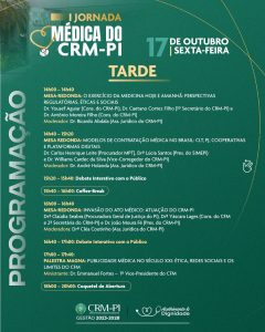 O Conselho Regional de Medicina do Estado do Piauí (CRM-PI) realizará, nos dias 17 e 18 de outubro, a I Jornada Médica do CRM-PI, no auditório da sede da instituição, em Teresina. O evento faz parte da programação alusiva à Semana do Médico, que terá várias outras ações, e é voltado exclusivamente para médicos e estudantes de medicina.