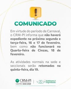 Acesse aqui a Portaria SEI nº 6, que dispõe sobre a suspensão das atividades deste CRM-PI durante o período carnavalesco equarta-feira de cinzas do corrente ano.